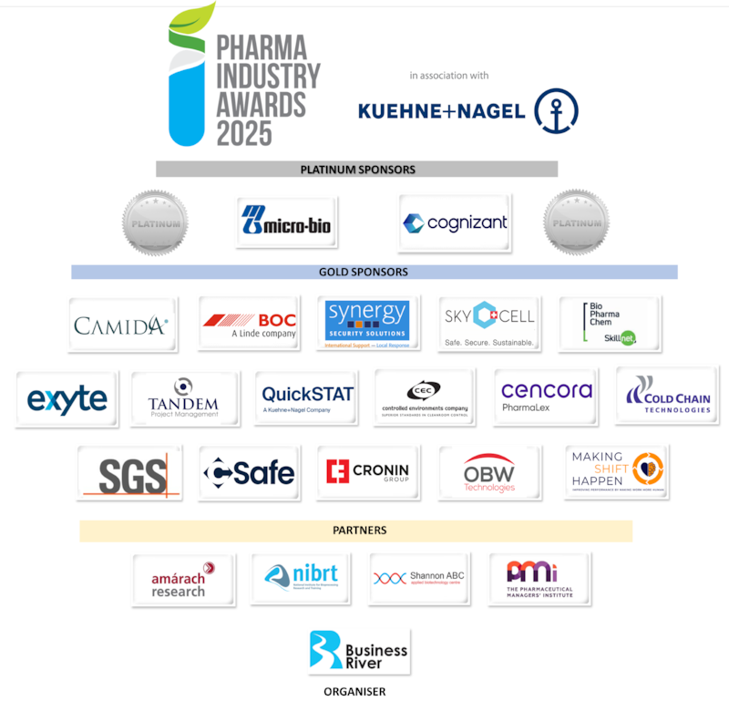 Kevin O’Driscoll, director of partnership programmes at awards organiser BusinessRiver, said: “Events like this are made possible through the support of sponsors. We are thankful to our title sponsor, Kuehne + Nagel, and our platinum sponsors, Micro-Bio and Cognizant, and our gold sponsors, Camida, BOC Gases Ireland, Synergy Security Solutions, Skycell, BioPharmaChem Skillnet, Exyte, Tandem Project Management Ltd., QuickStat, a Kuehne+ Nagel company, Controlled Environments Company, Cencora Pharmalex, Cold Chain Technologies, SGS Pharma, CSafe, OBW Technologies and Making Shift Happen”