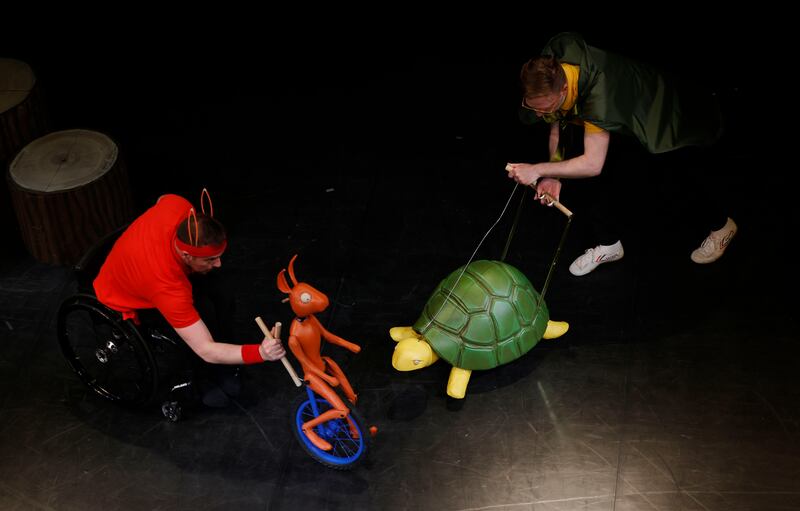 As he takes his place at the starting line, his fellow cast member Rob Heaslip flexes his muscles and puts his hands on the frame of a trolley that Dunn has expertly fashioned into a tortoise shape. Caoimhe Coburn Gray is limbering up in the background, getting ready to enter the scene as Mouse, while Helen Hall is crouching low just outside the theatre doors, rolling a long-limbed wooden grasshopper to and fro. Who will make it to the finish line first is anybody’s guess, but when you are working together, co-operating, collaborating, does victory really matter?