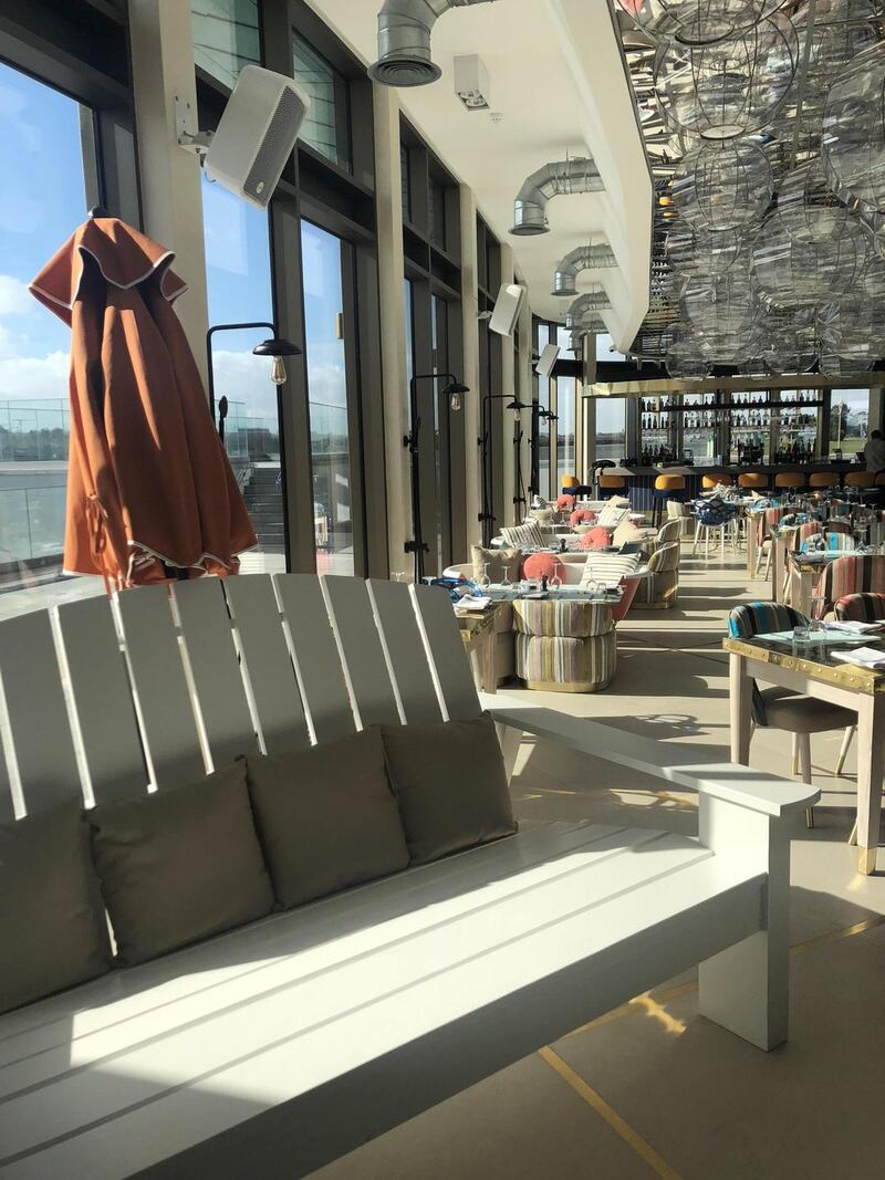 The seaside has been brought indoors courtesy of Serendipity By Design, an Dubai-based Irish firm. Classic roll-top free-standing baths have been halved and made into sofas. Overhead, are glass globes that resemble translucent jellyfish thanks to their fillers of fairy lights. Bournemouth Beach-style beach huts are the inspiration for the toilets. Even the floor staff’s striped shirts are a nod to the nautical.