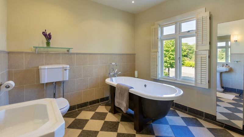 The house is now a bright, airy home presented in excellent condition, with high ceilings, walls either wallpapered with pale silvery patterns or painted neutral shades of white and cream. Its owners have an eye for detail evidenced by an upstairs press, where all the linen is neatly shelved and labelled by sheet and duvet cover size .